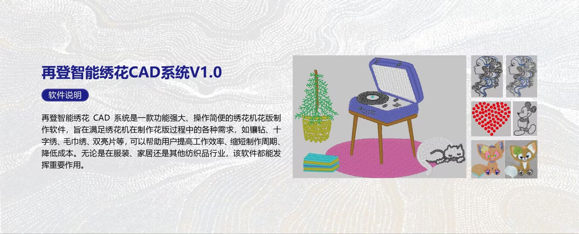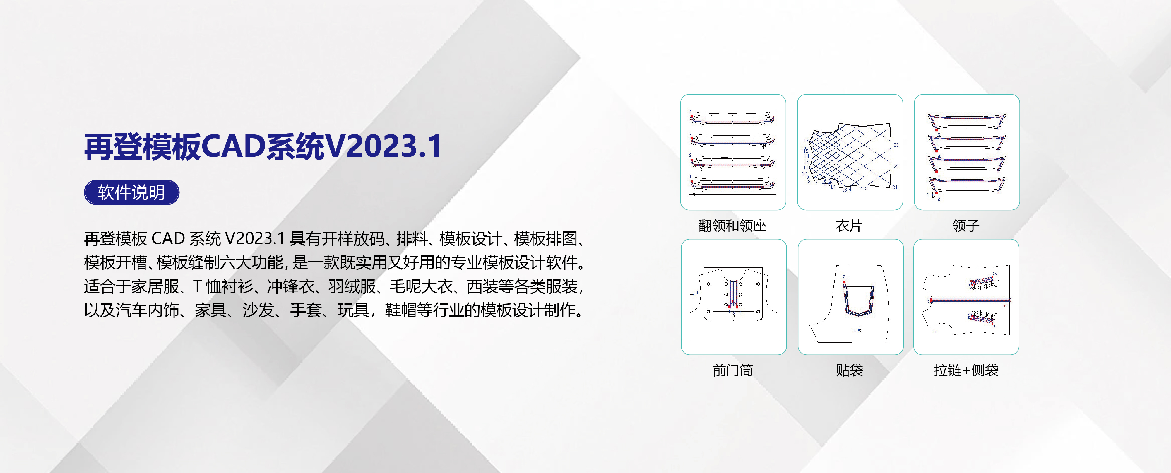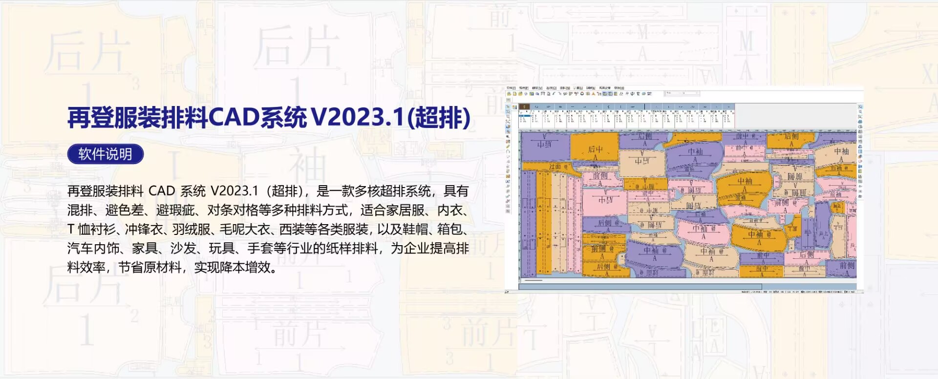 产品涵盖:服装CAD、超级排料、模板CAD、绣花CAD、冲绣缝CAD、簇绒CAD、数字化版房管理系统,其中服装CAD翻译有10多种语言版本,用户遍布全球100多个国家和地区。再登软件以技术创新为驱动,以客户需求为导向,为全球用户提供高效、智能的电脑设计解决方案,助力行业实现智能化、数字化转型